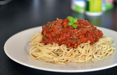 V hrnci ci na vetsi panvi rozehrejte na strednim plameni olivovy olej. Pridejte cibuli, smazte asi 2 minuty, pridejte mrkev a smazte dalsi 3 minuty. Pridejte trochu pepre a soli (ne moc, pozdeji budete pridavat slanou sojovku), pote koreni. Zamichejte a prilijte trochu oleje pokud je to prilis suche. Pridejte rozmackany cesnek a smazte asi 2 minuty, pote vmichejte sojovy granulat a dobre promichejte se smesi cibule, mrkve a koreni, dolijte sojovku a opet promichejte. Smes zalijte zeleninovym bujonem a par minut povarte, pote pridejte rajcatovy protlak, opet nechte minutu ci dve probublavat nez pridate sekana rajcata a vino. Snizte teplotu a nechte omacku na mirnem ohni dokud se neuvari spagety (cca 8 minut). Na konci vmichejte lahudkove drozdi a cerstvou nasekanou bazalku. Nezapomente vyndat bobkovy list!
